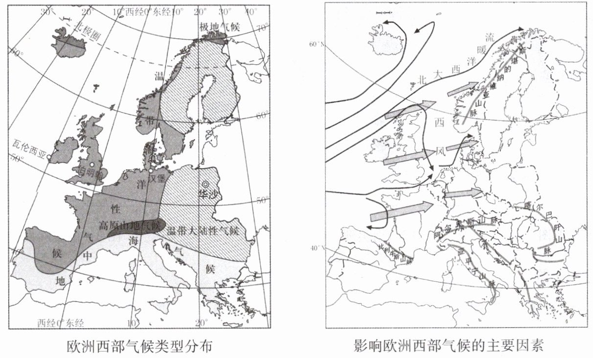 2. 读影响欧洲西部气候的主要因素示意图,将影响欧洲西部气候的主要因素及影响连线。