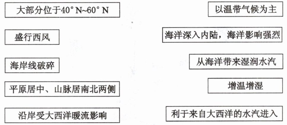 (3)三地均为温带海洋性气候,但从西向东在气候特征上表现出一定的差异主要是与大西洋的距离渐远,受海洋的影响逐渐降低,受大陆的影响逐渐加强。