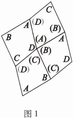 将四张卡纸叠在一起,用剪刀剪出四张完全一样的四边形,顶点标上字母A,B,C,D,然后按图1方式放置,由四边形四个内角之和等于360°就可以发现这个性质是成立的.