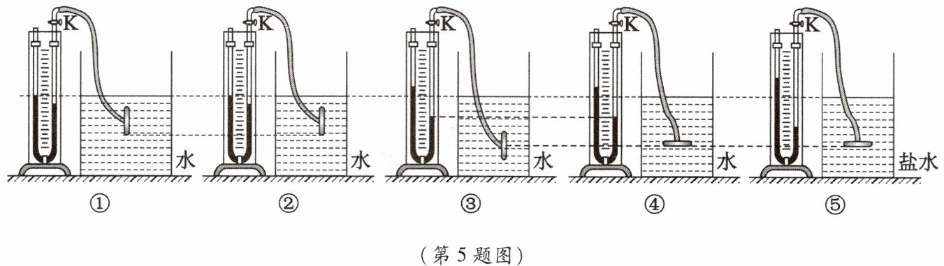 5. 小海发现,他站在齐胸深的水中时感觉胸口有压迫感。爱动脑筋的他产生了疑问:液体压强究竟与哪些因素有关呢?他猜想:液体的压强与液体的多少有关。为了验证猜想,他利用U形管压强计进行了如下实验探究。
