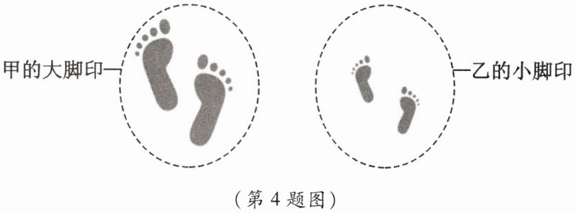 4. 如图所示,甲、乙两人一起在沙滩上散步,留下深浅相同、大小不同的脚印,则甲(
