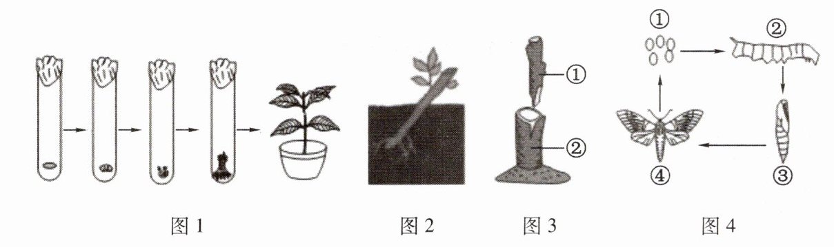 ]______嫁接______方式进行的培育。(2)从图中可以看出,家蚕、蝗虫和青蛙的发育过程都是______变态发育______。比较图4家蚕和图5蝗虫的发育过程,家蚕的发育过程比蝗虫多了[
