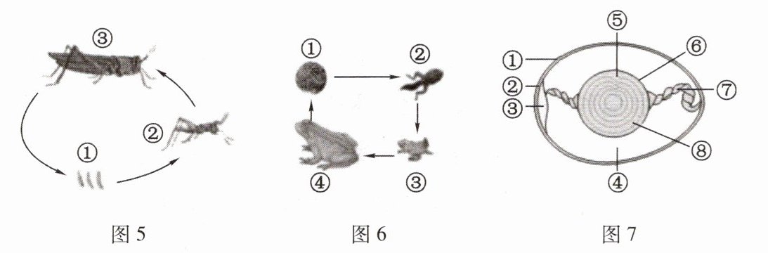 10. 生物界有许多奇妙的现象值得我们去探索,某社团同学选取了多种生物,并对这些生物生殖和发育的有关问题进行了探究。图1、图2、图3为无性生殖应用示意图,图4、图5、图6分别为家蚕、蝗虫、青蛙的生殖发育示意图,图7为鸟卵的结构,请据图及所学知识回答问题。