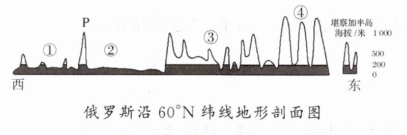 读“俄罗斯沿 $60^{\circ}N$ 纬线地形剖面图”,完成 3~5 题。