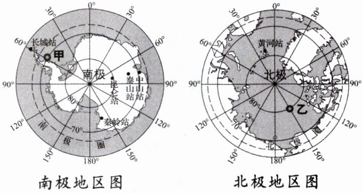 13. 读“南极地区图”“北极地区图”,回答下列问题。