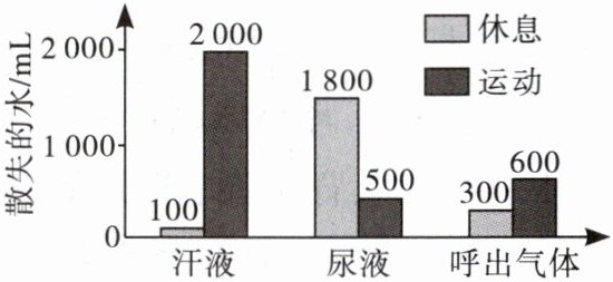 10. 测定某人在环境和进食相同的条件下,完全休息和运动两种不同状态时,身体散失水(毫升)的情况,结果如图。下列有关分析正确的是(