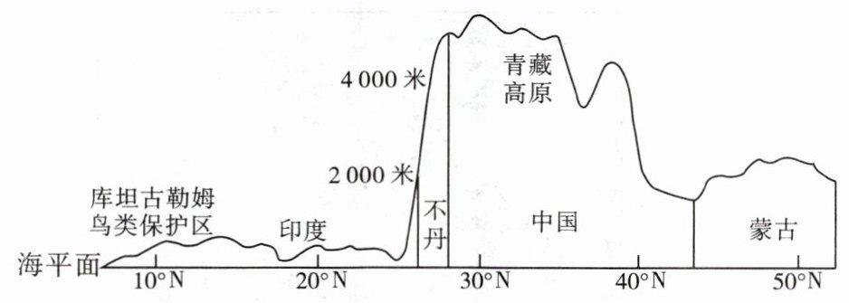 8. 斑头雁每年都要在印度最南端的库坦古勒姆鸟类保护区与蒙古之间迁徙。下图示意斑头雁迁徙路线上的海拔高度曲线。由此可知,斑头雁(
