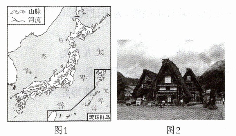 材料二 图1为日本地形图,图2为“合掌造”示意图。