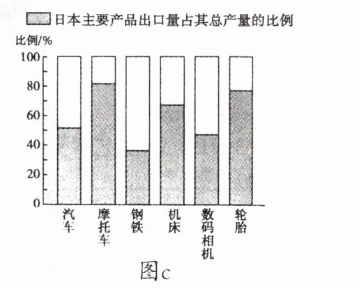 2.日本陆地面积37.8万平方千米,其中山地、丘陵占76%;人口约1.24亿(2023年),其中农业人口约200万。日本农业规模较小,粮食自给率低,粮食大量依靠进口。读日本位置图(图a)和2010年日本主要工业原料对外依赖程度图(图b)、日本主要产品出口量占其总产量的比例图(图c),回答下列问题。