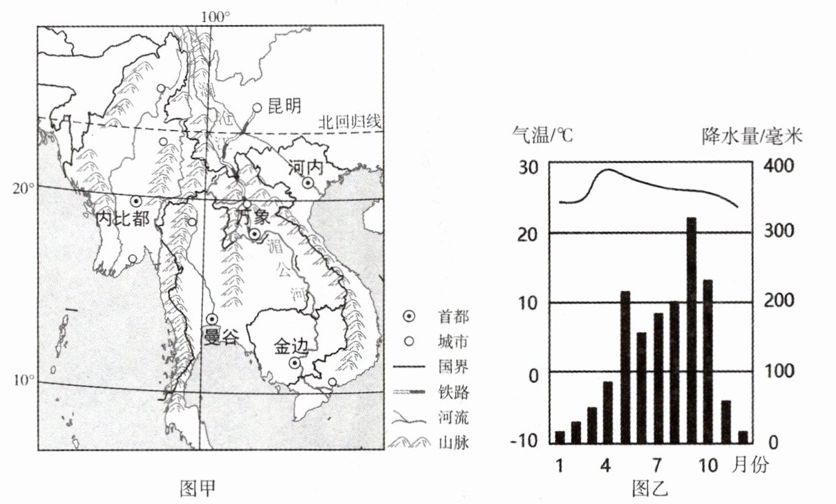 1.结合中老铁路示意图(图甲)、A地气温曲线与降水量柱状图(图乙)和相关材料,回答下列问题。