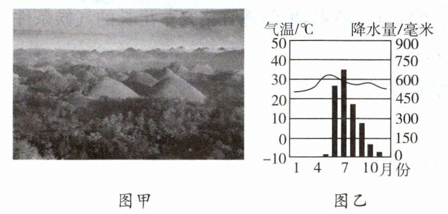 材料一 菲律宾薄荷岛的草在雨季时为绿色,旱季则被炎热的太阳晒干变成咖啡色,酷似巧克力,因此得名“巧克力山”。图甲为薄荷岛景观图,图乙为薄荷岛气温曲线和降水量柱状图。