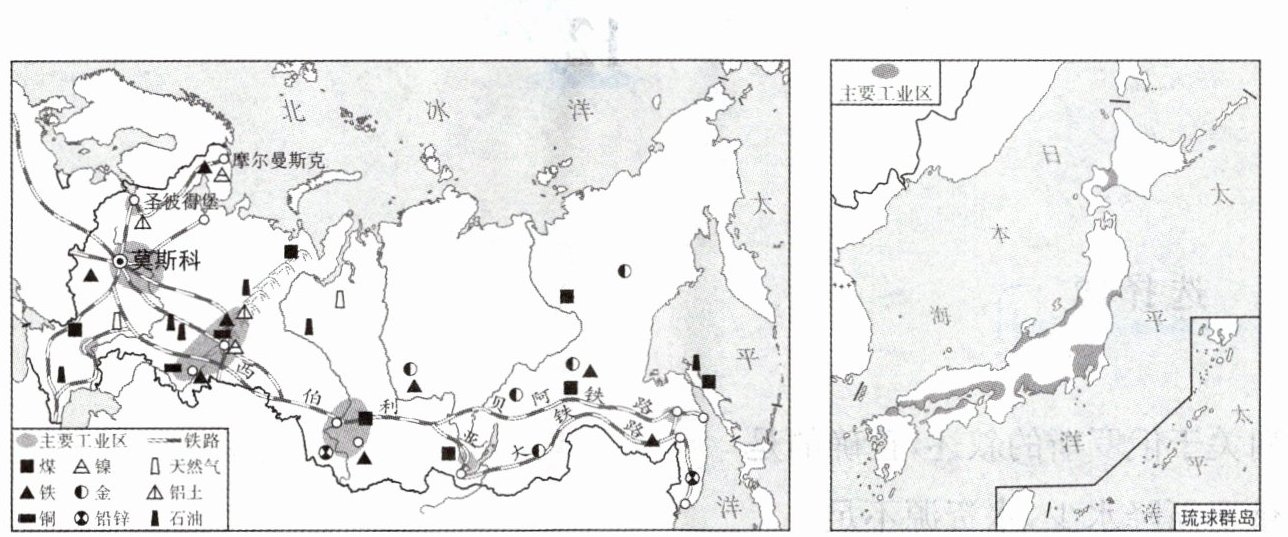 (2) 读图可知,俄罗斯工业区的分布特点是