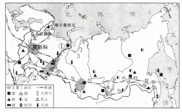 (3) 莫斯科 西伯利亚 南部气温较高,矿产资源丰富,人口、城市及工业区分布较为集中