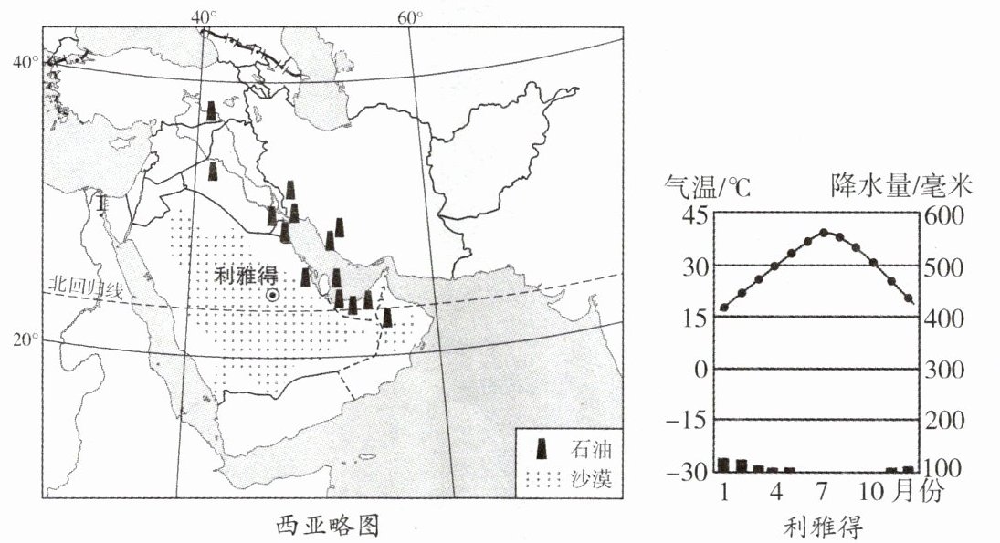 2.近年来,以沙特阿拉伯为代表的西亚各国,积极参与清洁能源项目建设,开启了西亚地区应用可替代和清洁可再生能源的新时代。课堂上同学们以“西亚能源的现在和未来”为主题开展小组探究学习。下为西亚略图及利雅得气候资料图,据此回答下列问题。