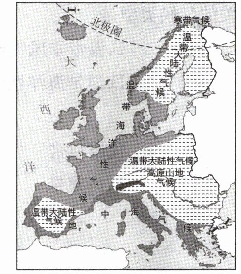 油橄榄主要种植在地中海沿岸地区,是典型的亚热带常绿硬叶树种,具有独特的习性,树叶呈尖细状,叶片向阳的一面具有蜡质层。读欧洲西部气候类型分布图,完成1、2题。