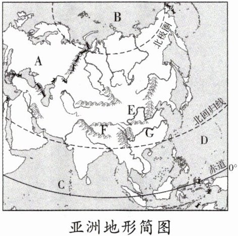 1. 我们生活的大洲——亚洲,地域辽阔,山岳巍峨,河流众多。读亚洲地形简图,回答下列问题。