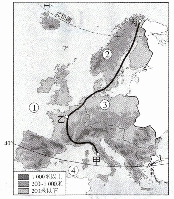 (2)7月初,张明同学与父母去欧洲旅游,行程为图中的甲→乙→丙。他们首先来到甲国(意大利),该地气候类型为