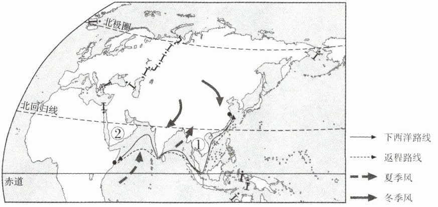 (大洋)。(2)明朝时期没有发动机,船队航行主要依靠风力驱动。郑和船队出发的季节最有可能是