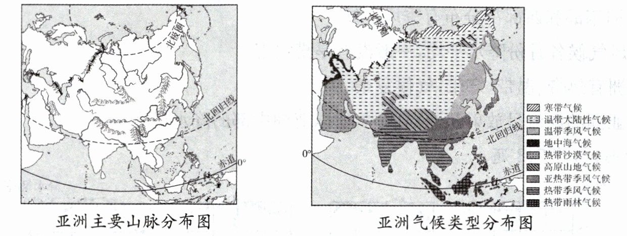 2. 读亚洲主要山脉分布图和亚洲气候类型分布图,回答下列问题。