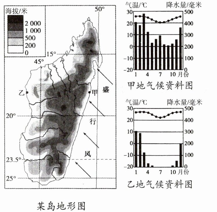 2.读某岛地形图及甲、乙两地气候资料图,回答下列问题。
