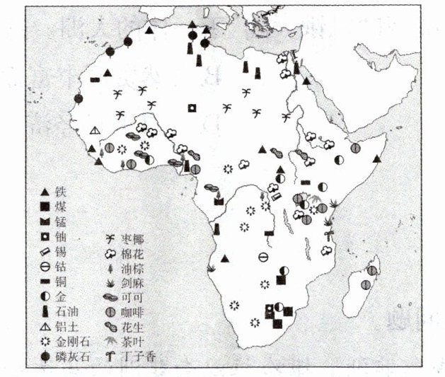 2022 年 4 月 28 日,“非洲好物网购节”在杭州市启动,“把直播间开到非洲去”是本次活动的一大亮点。下图为非洲主要农矿产品分布图。读图,回答 3、4 题。