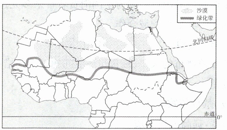 材料二 非洲多国合作实施“绿色长城”计划,修建一条位于撒哈拉沙漠南缘,横贯非洲大陆的防护林带。