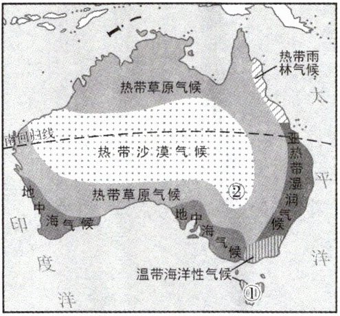 如果说澳大利亚是一本书,广袤和富饶就是它的卷首语。翻开书的扉页,树袋熊的欢呼声、牧羊人的哨子声、采矿场的轰隆声……交织成悠扬的文字,谱写出地球上美妙的交响曲。下图为澳大利亚气候类型图。