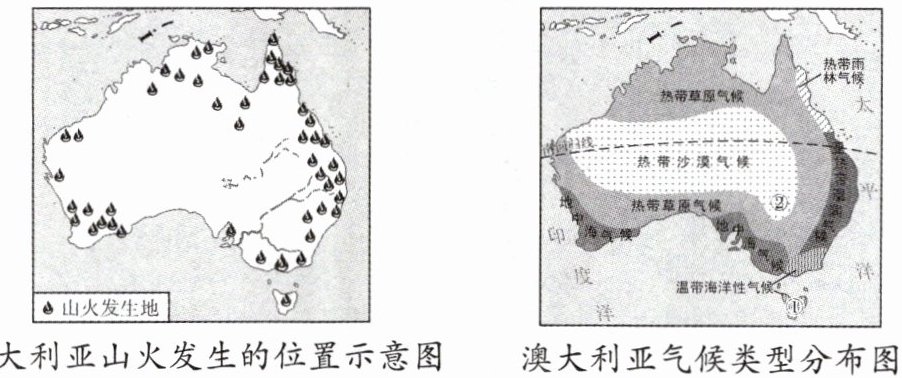 2.澳大利亚森林的主要树种是桉树,占森林总面积的70%,桉树的树皮、树叶富含油脂。2019年末至2020年初的这个夏天,澳大利亚人将其称为“黑色夏天”。那场持续了近半年的山火,造成了33人死亡,约30亿只动物被烧死,3000多所房屋被烧毁,造成数十亿美元损失。下面为澳大利亚山火发生的位置示意图和澳大利亚气候类型分布图。结合图文材料,回答下列问题。