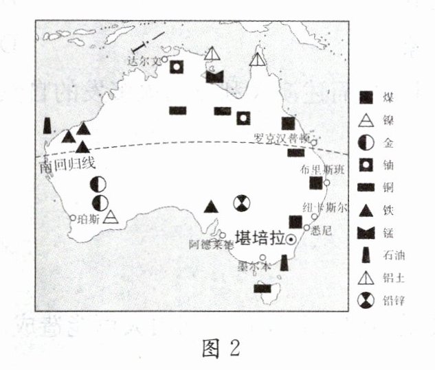 (2)从图2中可看出澳大利亚矿产资源很丰富,其中