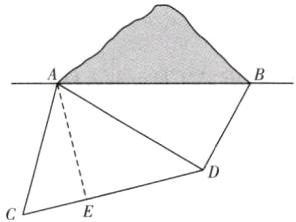 (1) 得 $ \triangle ADE$ 是等腰直角三角形,且 $AD = \frac{3 \sqrt{3} }{2} ( \mathrm{km} ) $,$\angle ADE = 45 ^ { \circ } $。$\because \angle CDB = 135 ^ { \circ } $,$\therefore \angle ADB = 135 ^ { \circ } - 45 ^ { \circ } = 90 ^ { \circ } $。$\therefore AB = \sqrt{AD ^ { 2 } + BD ^ { 2 } } = \sqrt{ \left( \frac{3 \sqrt{3} }{2} \right) ^ { 2 } + \left( \frac{3}{2} \right) ^ { 2 } } = 3 ( \mathrm{km} ) $,即隧道 $AB$ 的长为 $3 \mathrm{km} $。