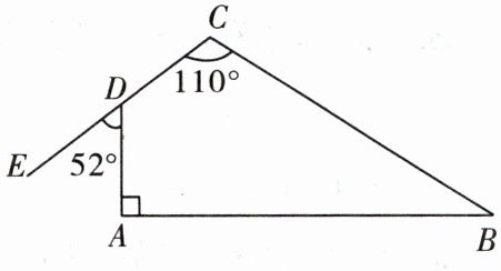 10. 如图,在四边形$ABCD$中,$AD⊥AB$,$∠C=110^{\circ }$,它的一个外角$∠ADE=52^{\circ }$,求$∠B$的度数.