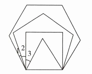 7. 如下左图,在平面上,将边长相等的正三角形、正四边形、正五边形、正六边形的一边重合并叠在一起,则$∠3+∠1-∠2=$