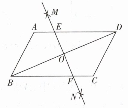 2. 如上右图,在平行四边形 $ ABCD $ 中,分别以点 $ B $,$ D $ 为圆心,大于 $ \frac{1}{2}BD $ 的长为半径画弧,两弧相交于点 $ M $,$ N $,过 $ M $,$ N $ 两点作直线交 $ BD $ 于点 $ O $,分别交 $ AD $,$ BC $ 于点 $ E $,$ F $,下列结论不正确的是(
