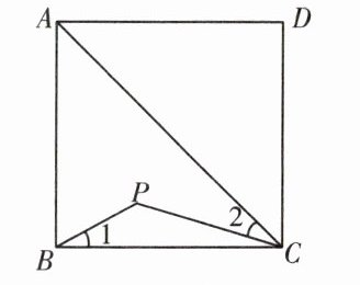 7. 如下左图,点 P 是正方形 ABCD 内位于对角线 AC 下方的一点,$∠1=∠2$,则$∠BPC$的度数为______