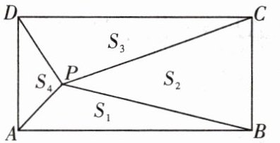 4. 如下左图,$P$ 是矩形 $ABCD$ 内的任意一点,连接 $PA$,$PB$,$PC$,$PD$,得到 $\triangle PAB$,$\triangle PBC$,$\triangle PCD$,$\triangle PDA$,设它们的面积分别为 $S_1$,$S_2$,$S_3$,$S_4$,给出如下结论:① $S_1 + S_2 = S_3 + S_4$;② $S_2 + S_4 = S_1 + S_3$;③ 若 $S_3 = 2S_1$,则 $S_4 = 2S_2$;④ $S_1$,$S_2$,$S_3$,$S_4$ 不可能全相等。其中正确的有(