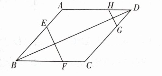 2. 如上右图,在菱形 $ABCD$ 中,点 $E$,$F$,$G$,$H$ 分别是 $AB$,$BC$,$CD$,$AD$ 上的点,且 $BE = BF = CG = AH$。若菱形的面积等于 $24$,$BD = 8$,则 $EF + GH=$(