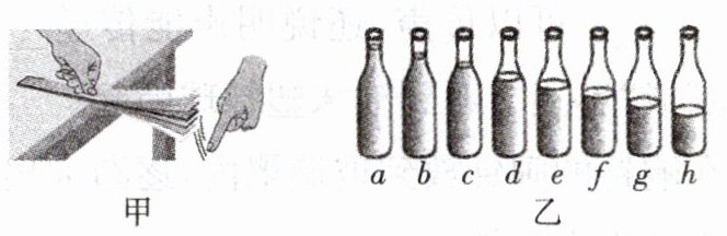 (2)如图乙所示,在8个相同的玻璃瓶中灌入不同高度的水,仔细调节水的高度。用相同大小的力向瓶内吹气,就可以发出声音,音调最高的是瓶__