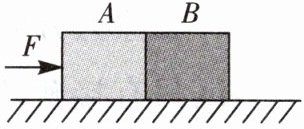 10. 如图所示,质量均为 2 kg 的长方体木块 A、B 静止在粗糙水平桌面上,用大小为 10 N 的水平推力 F 作用在 A 的一端,使两木块一起做匀速直线运动。已知物体运动时所受滑动摩擦力与物体间的压力成正比,比例系数为 k(g 取 10 N/kg)。求: