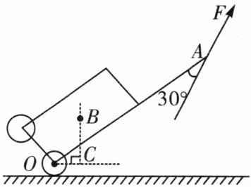 4.如图所示为一拉杆旅行箱的示意图,将其视为杠杆,O为支点,B为重心,BC为竖直方向,A为拉杆端点。已知箱重为250N,OA为120cm,OC为24cm。在A点沿图示方向施加动力F,箱子静止,则动力F的大小为