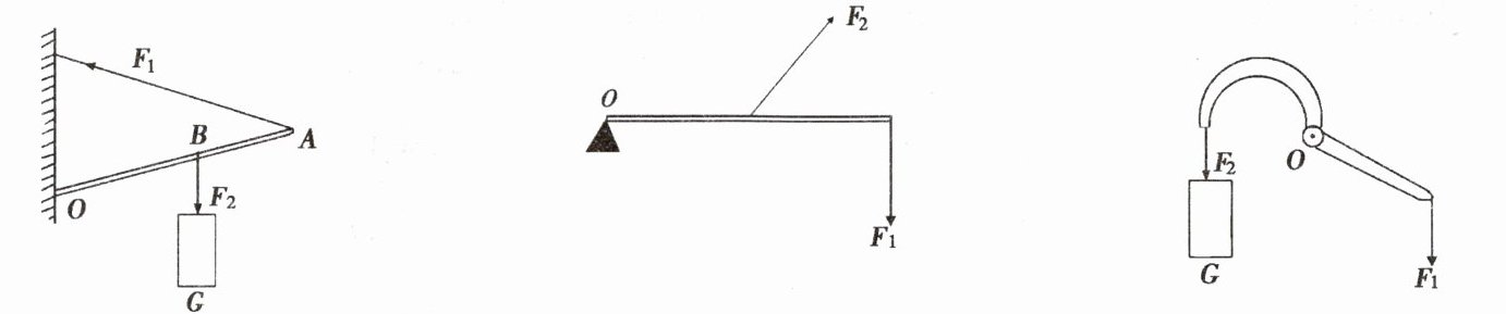 综上,按照力臂的定义和画法,分别对三个图中的$\boldsymbol{F_{1}}$、$\boldsymbol{F_{2}}$作出力臂 。