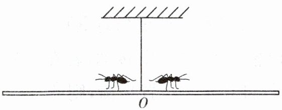 8.如图所示,用一细线悬挂一根粗细均匀的轻质竹签,使其静止在水平方向上,$O$为竹签的中点。这时有两只蚂蚁同时从$O$点分别向着竹签的两端匀速爬行,在蚂蚁爬行的过程中竹签在水平方向始终保持平衡,则(