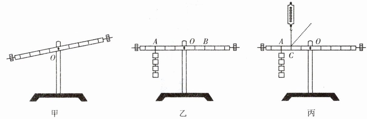 (6)如图丙所示,用弹簧测力计在$C$处竖直向上拉,使杠杆在水平位置平衡。当弹簧测力计在原位置逐渐向右倾斜时,使杠杆仍然在水平位置平衡,则弹簧测力计的示数将