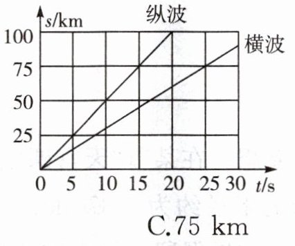 7.利用地震波中纵波和横波的传播速度不同可以监测震源的位置。如图所示,两条直线分别表示这两种波从震源开始传播的距离$(s)$与所用时间$(t)$的关系,若测得这两种波先后到达某监测站的时间间隔为$10s$,则震源到该监测站的距离为 (