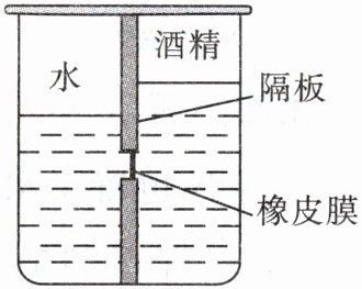 6. 容器中间用隔板分成左右两个部分,隔板下部有一圆孔用面积为$1cm^{2}$的薄橡皮膜封闭。在容器左右两侧分别倒入水和酒精,橡皮膜中心到水面的距离为 0.1 m,如图所示,橡皮膜相平。已知$ρ_{水}=1.0×10^{3}kg/m^{3},ρ_{酒精}=0.8×10^{3}kg/m^{3}$,则下列说法正确的是(
