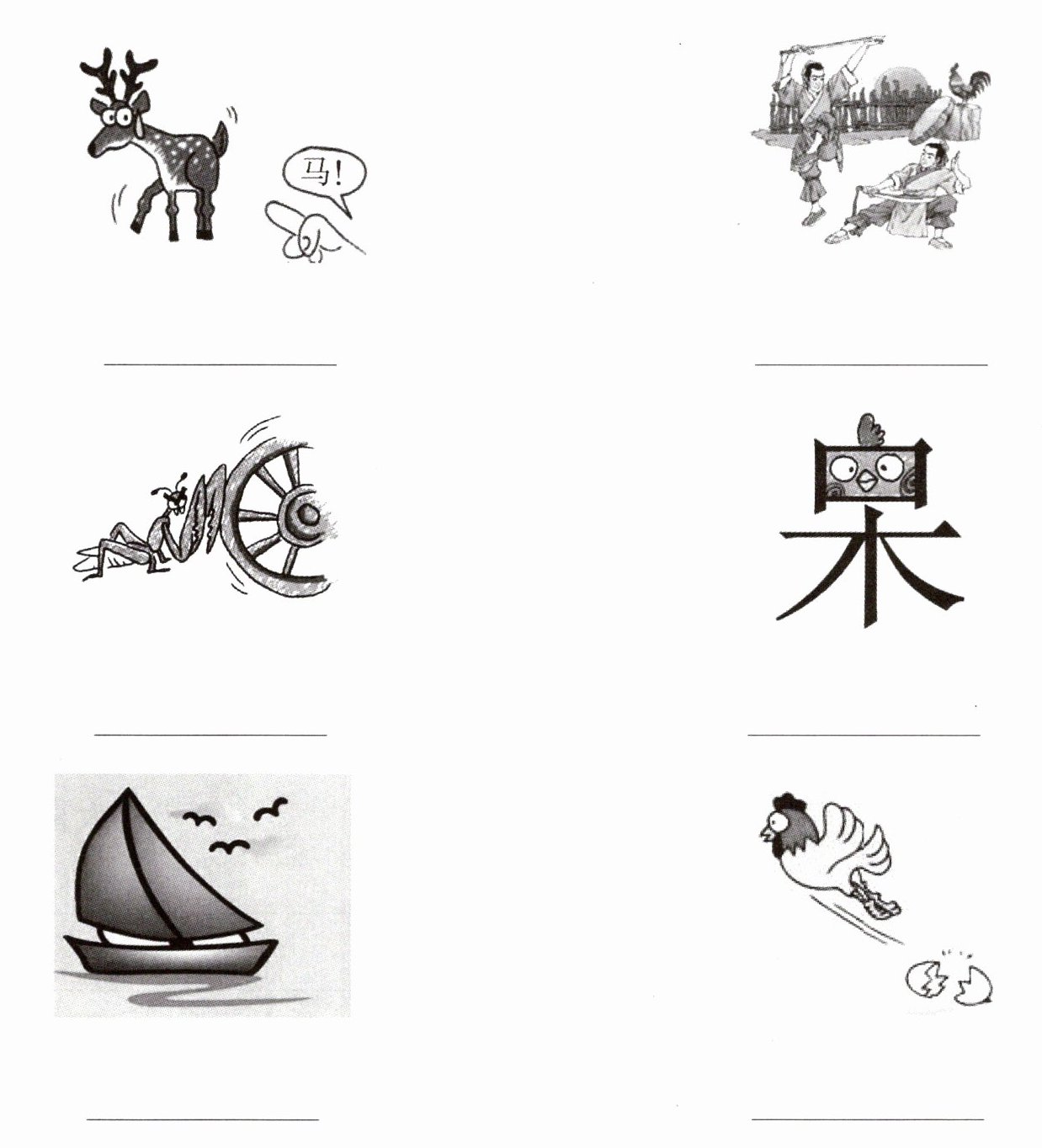 指鹿为马;闻鸡起舞;螳臂当车;呆若木鸡;一帆风顺;落井下石。