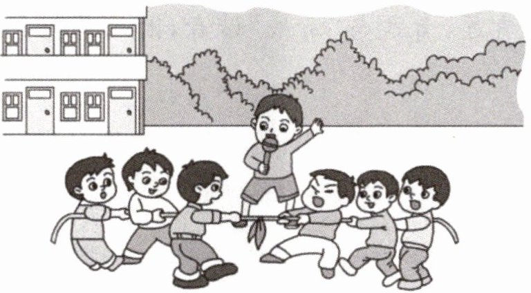 绳子中间的红布条一会儿向我们这边移,一会儿又向对方那边移,比赛进入了白热化阶段。这时,我们班的大力士小刚大喝一声:“大家一起用力!”同学们听了,顿时浑身充满力量,齐心协力往后拉。红布条慢慢向我们这边移动,最终过了我们班的白线。