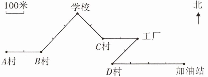 )米到D村。(2)说一说从加油站到学校的行走路线。