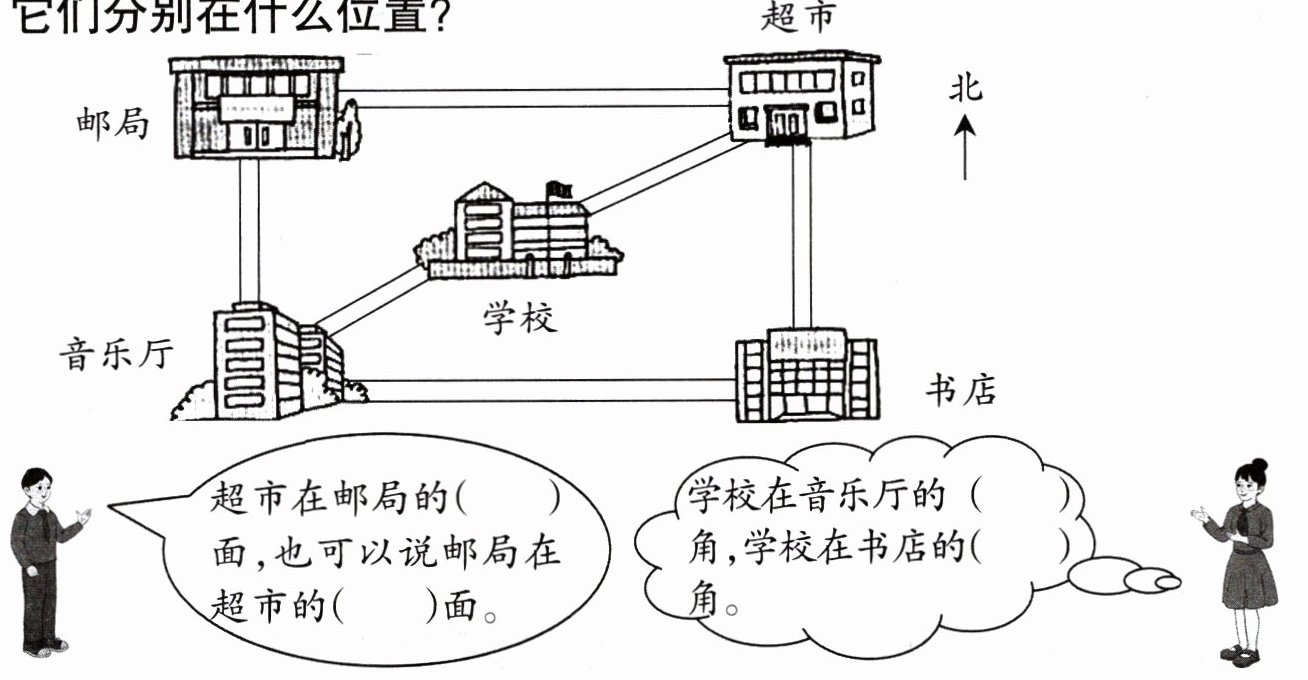 请你也像上面的小朋友一样,试着说一说图中建筑物相对的位置方向:(