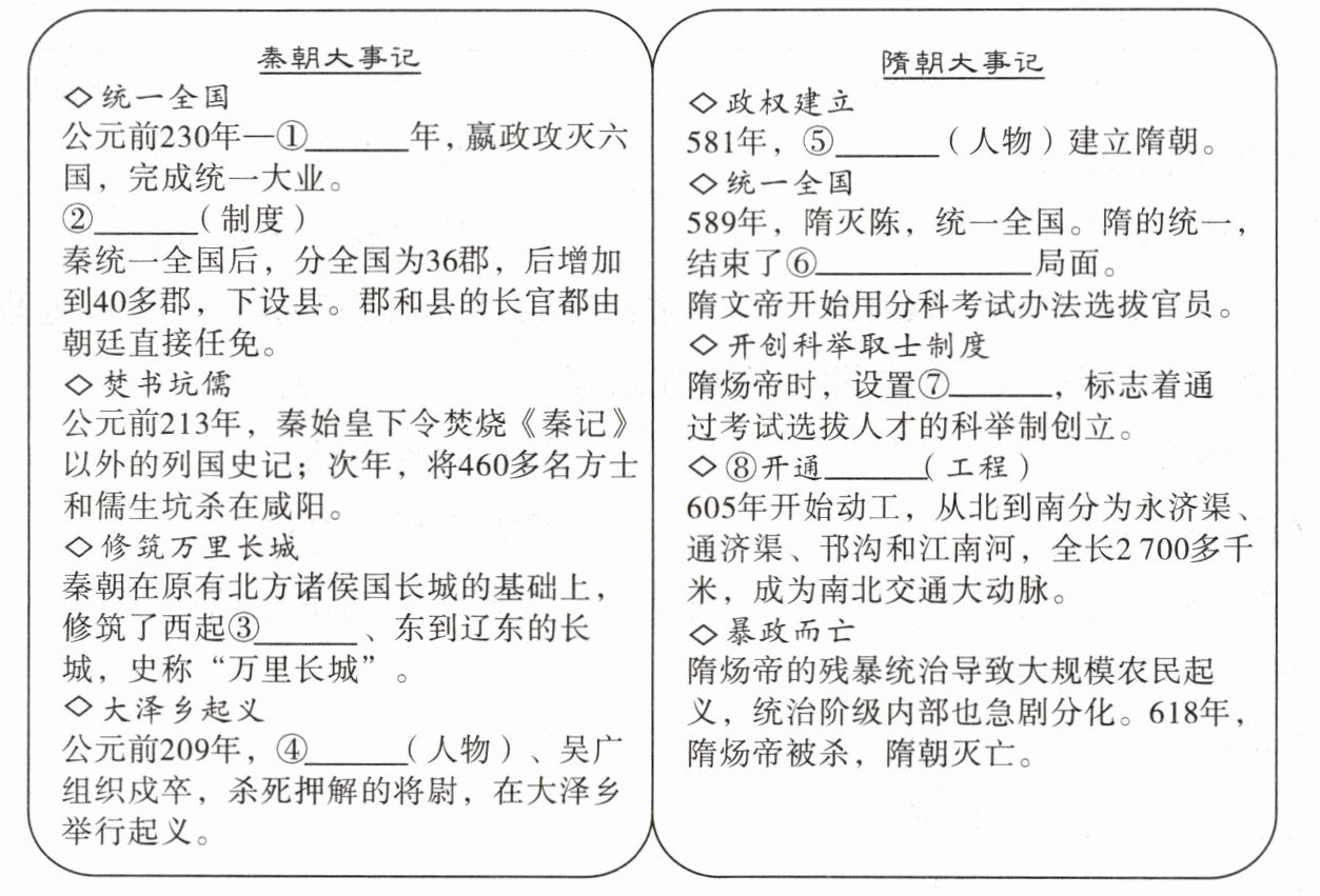 (1)将秦朝与隋朝大事记中所缺内容补充完整。秦朝:①