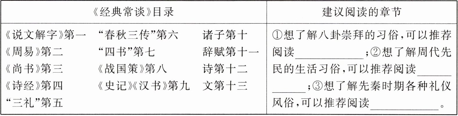 (4)为了解传统经典著作中有关“民俗文化”的记载情况,请根据不同的阅读需求,参考《经典常谈》的目录,分别推荐相关的章节阅读。(3分)